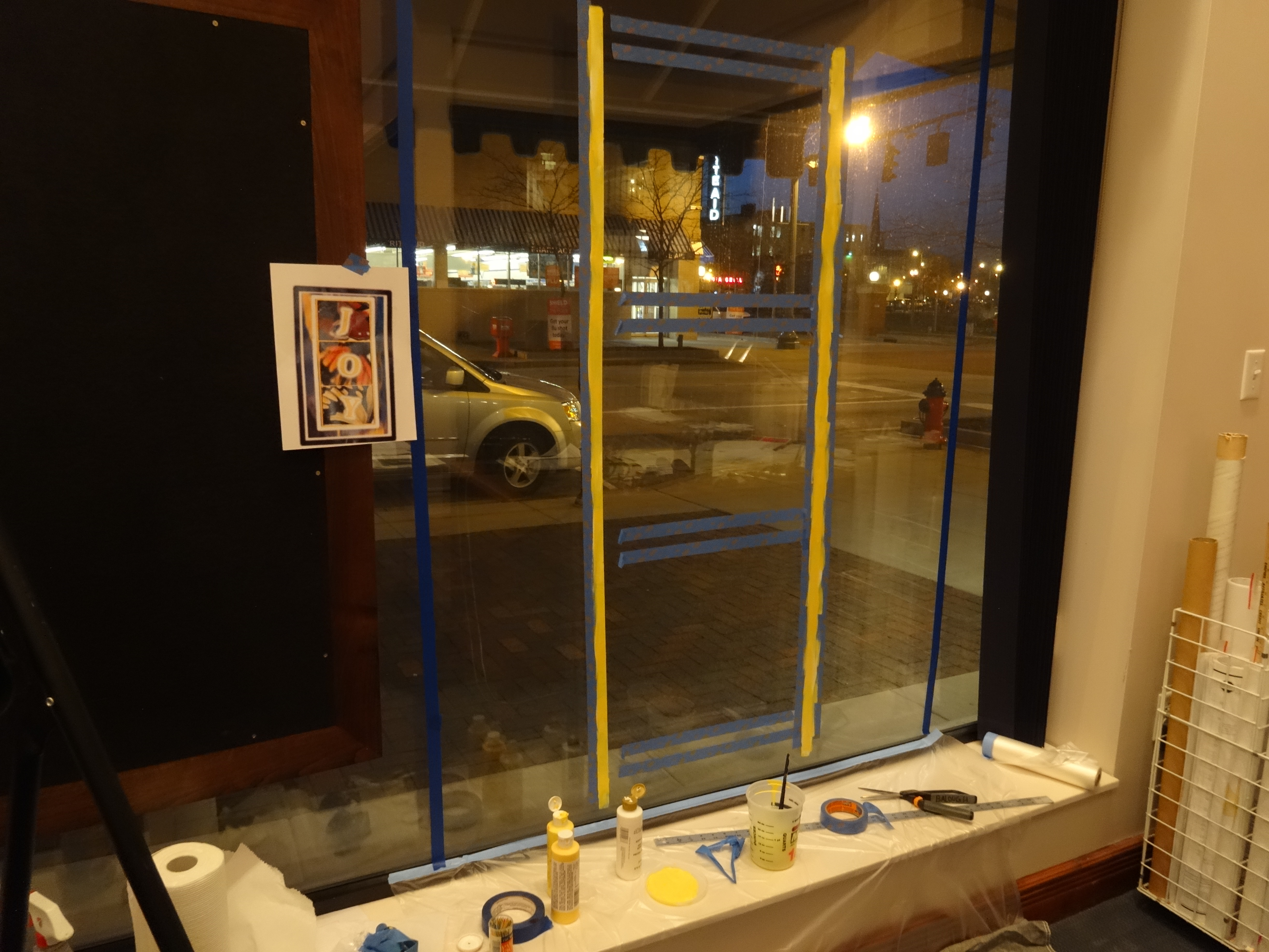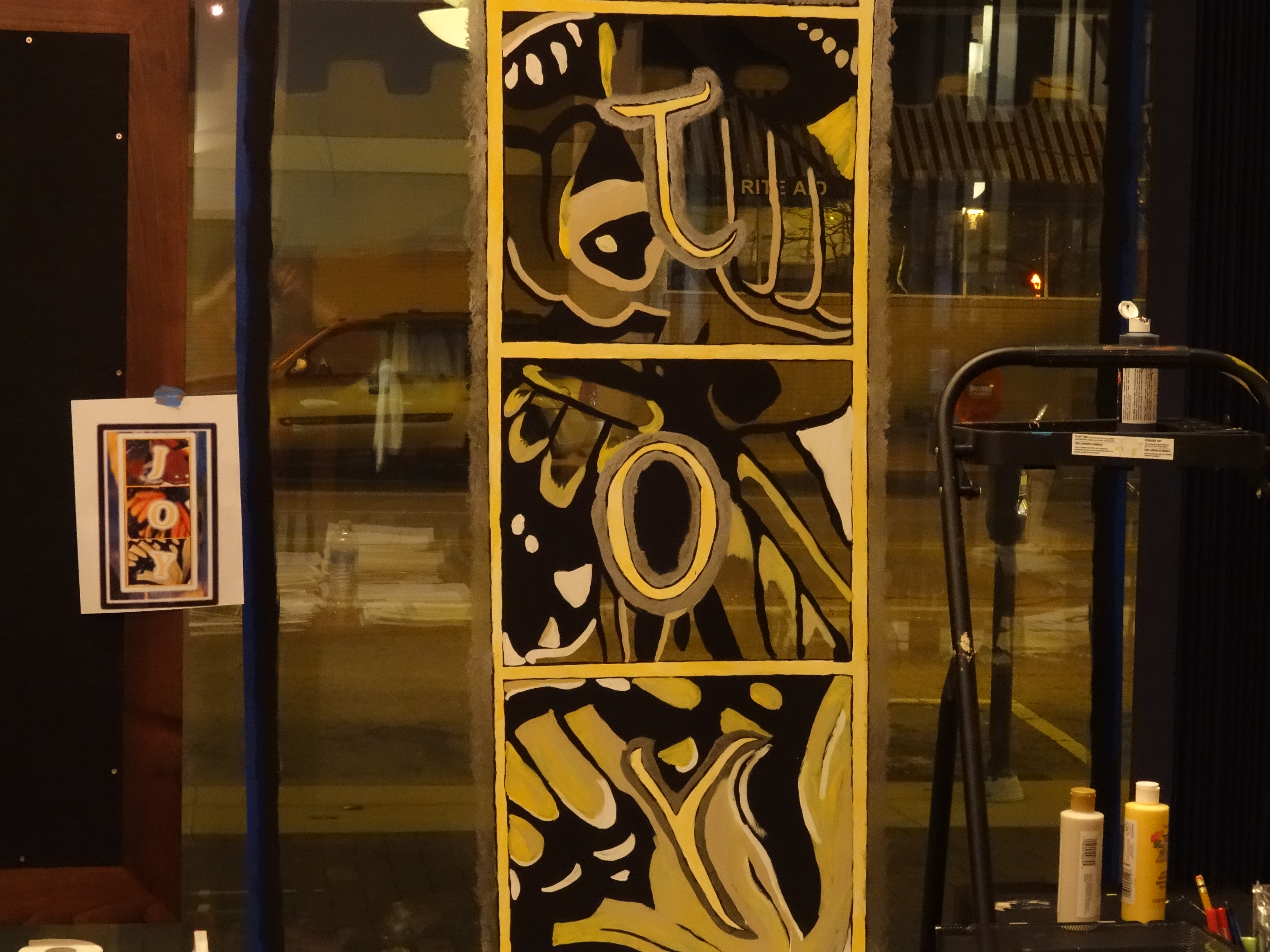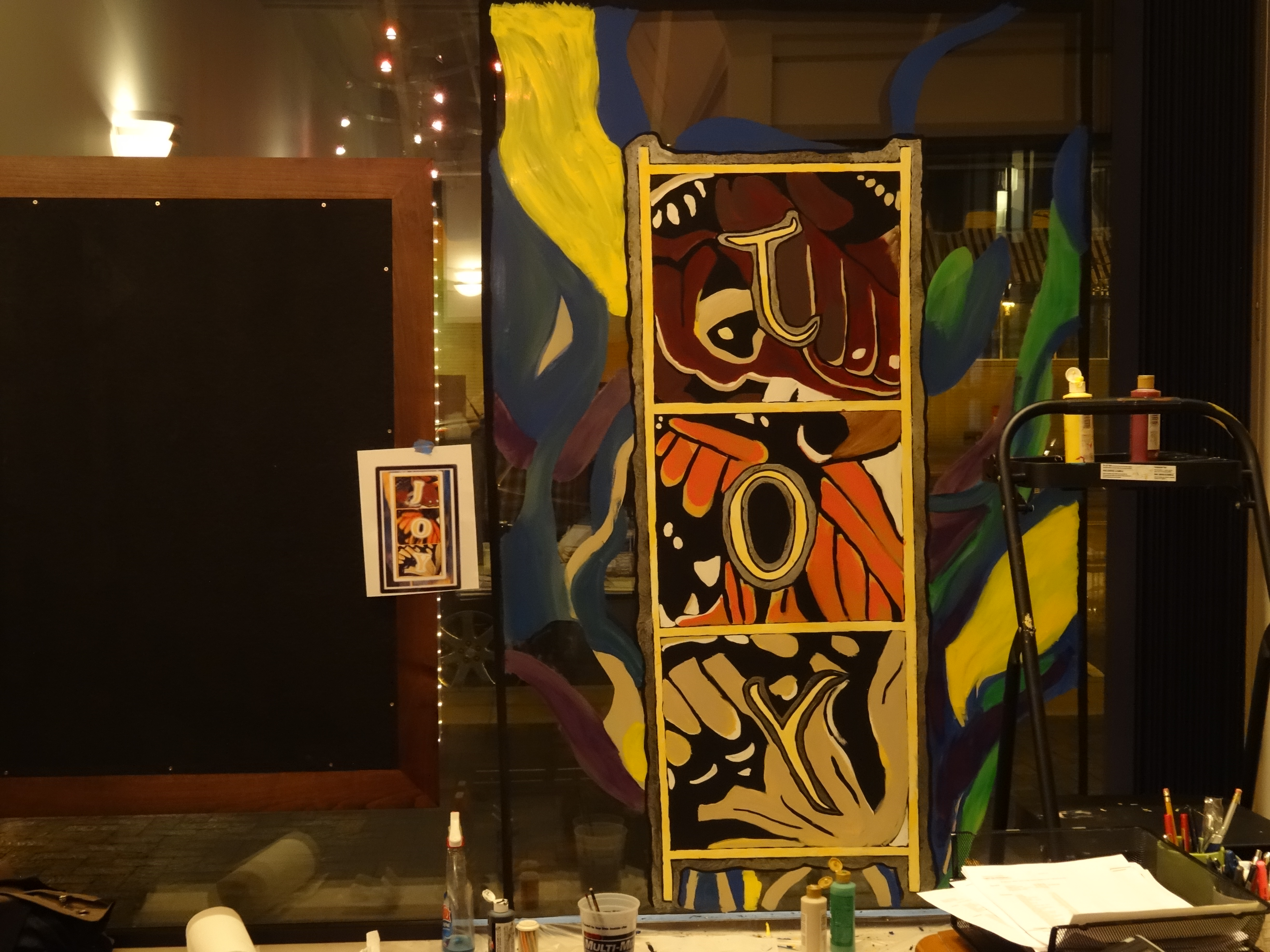 Next I filled in the golden yellow outlines for Jacob’s ladder and the reverse letters of Joy. You can see the office I was working in, part of the Canton Chamber of Commerce. Business meetings were happening behind me as I painted. I’ve done many painting demonstrations and public art pieces now, so I actually enjoy having an audience. (I guess that’s also obvious since I am blogging this to the world)