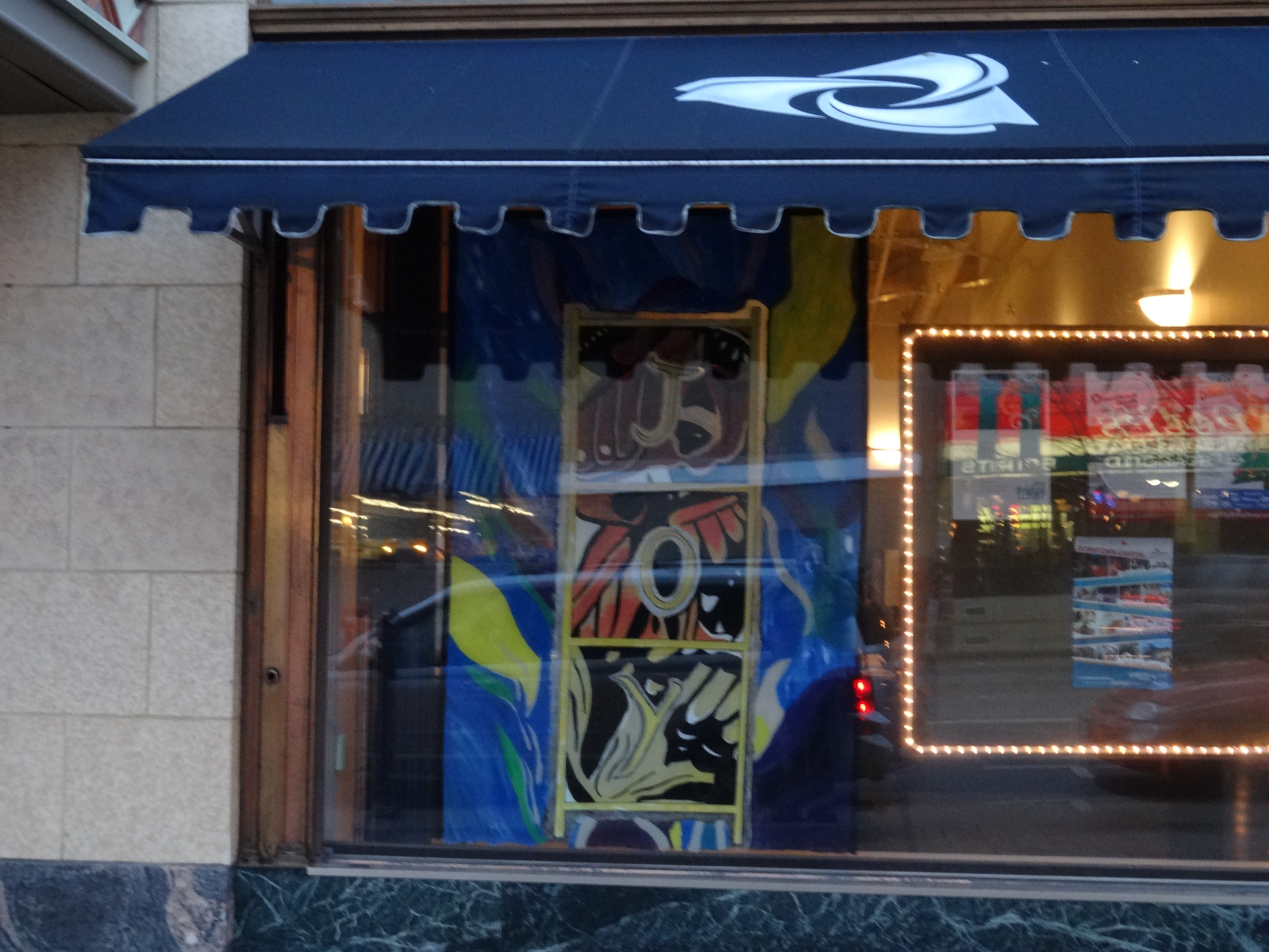 Here is the completed outside view, with the letters happily facing the correct direction (I was worried about that). The reflections make this a bit difficult to see at this time of day. I am hoping to get back and take a night shot with it illuminated from within before December ends and they scrape it off.