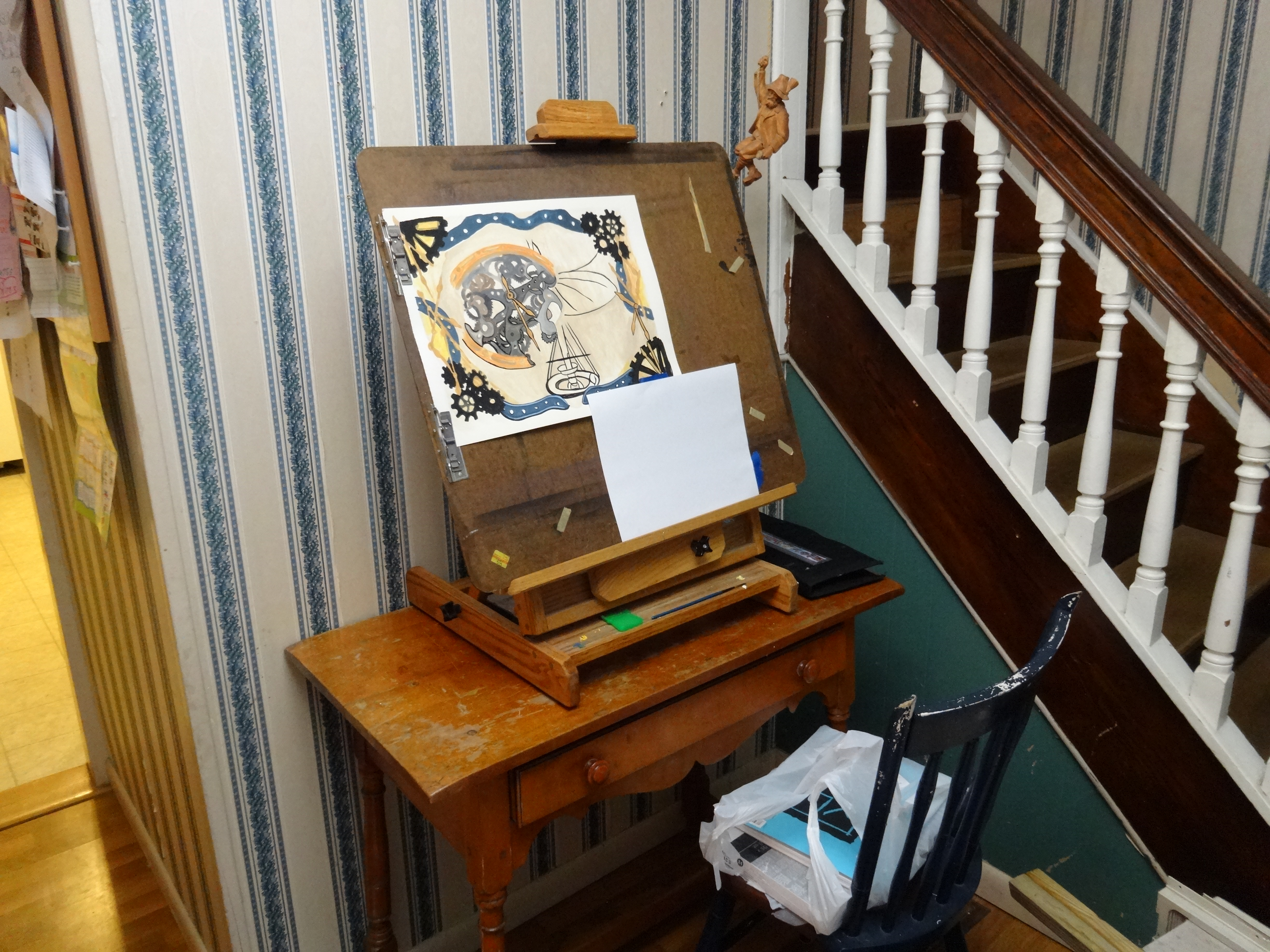 This is where the treadmill used to collect dust and coats. I have a teeny tiny artist studio now! My own little space, where the paper, paints and pencils will always be ready and calling out to me. Gone are the days of commandeering the dining room table and spending and our just to dig out my paints and put them all away again so we can eat dinner. I’m so excited! My current project is on the easel there in the underpainting stage, I’ll be sharing more about that in future posts.