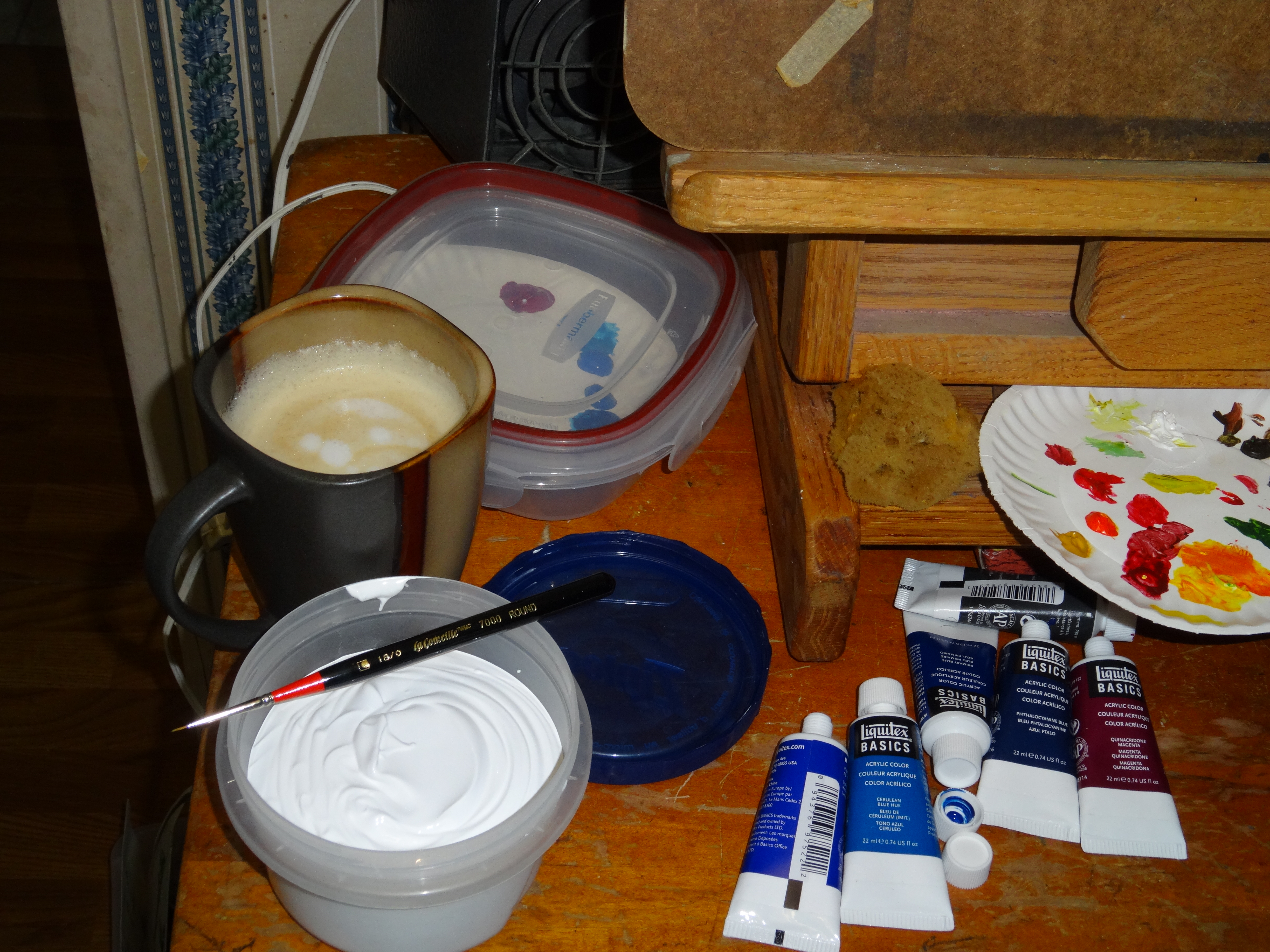 The other items here, listed in order of importance: My wonderful hand-frothed latte, my new teeny tiny detail brush, my paper plate palettes, a sealed tupperware box to keep a paper plate palette from drying out, and of course the paint itself. In addition to the Mural Paint, I am also using Liquitex. Each brand of paint has its own unique properties, but I have found that I can get any of them to do what I want eventually after some experimenting. So I usually buy whatever is on sale for indoor paint.