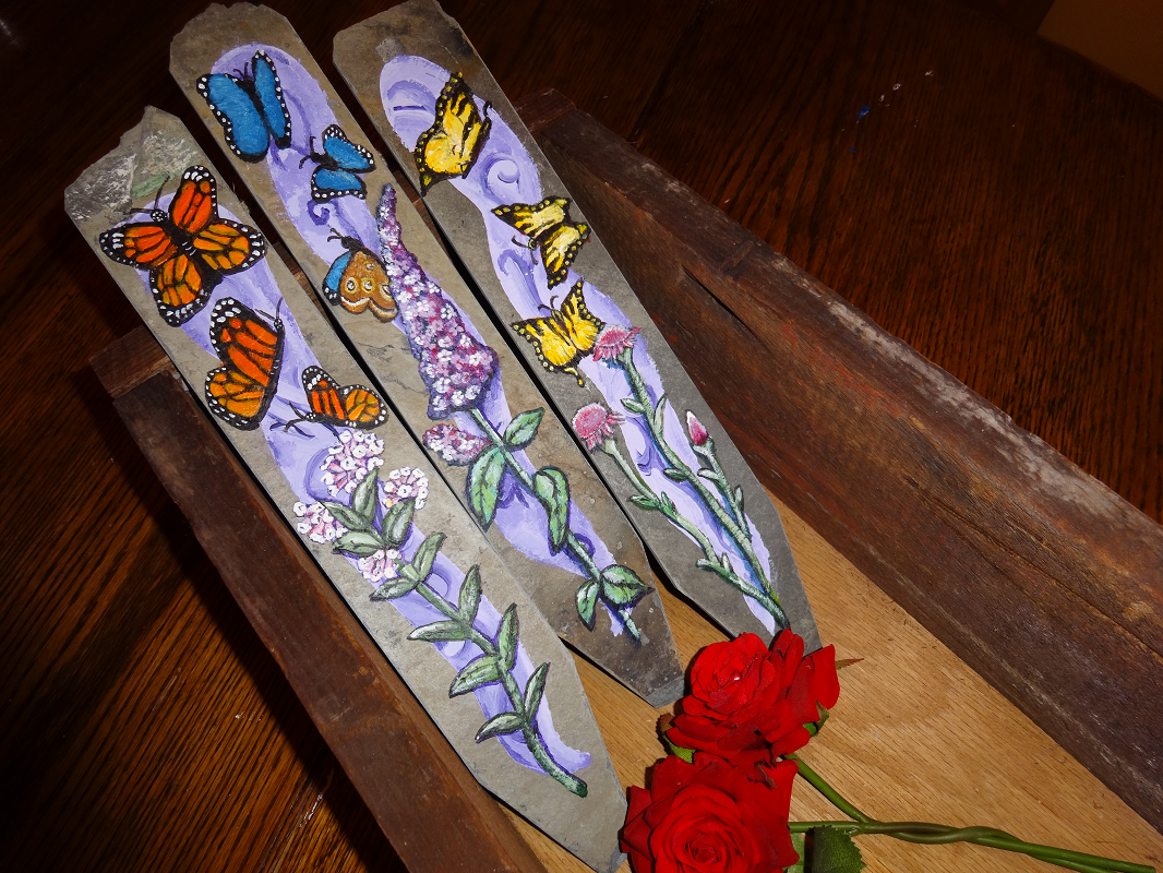 The project I have been working on the past few days came from a simple conversation. Someone liked my slate garden marker stakes, but wanted something more decorative, less functional. She wanted something with flowers and butterflies covering the entire stake, and requested no writing, no label. I asked if specific flowers were favored, and she said No, that she loved all flowers. She did state her favorite colors included purples and lavenders, but otherwise has no color restraints.
