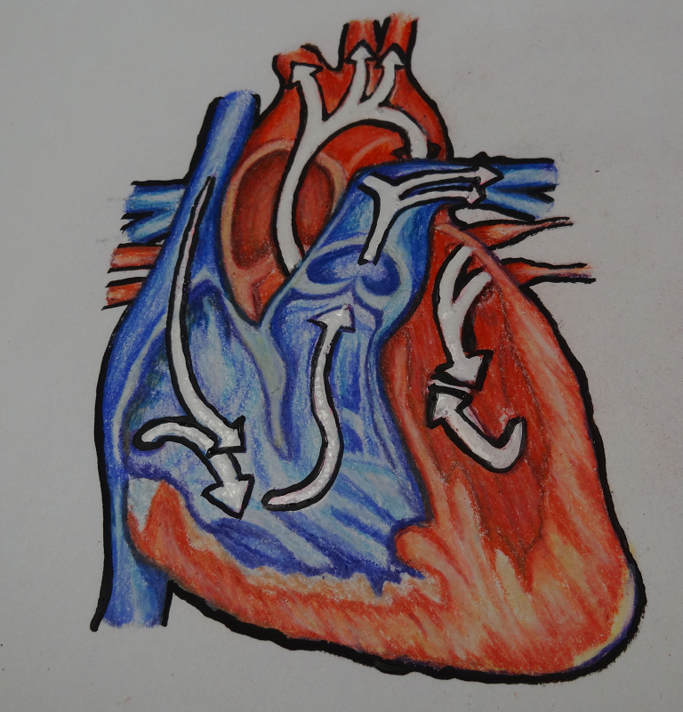I had planned to add the lines and labels digitally once it was in the computer, but as I went to do this, I noticed the view I chose did not clearly show the 4 chambers as requested. So I went back to what they sent and decided to digitally adjust their existing image instead, which I think is what I should have done in the first place. It can be difficult to know which tools to use to complete a project when we have so many available to us. I don’t own the original image, so I can’t share the before view. Here is my final digital image though, complete with labels and blood flow arrows.
