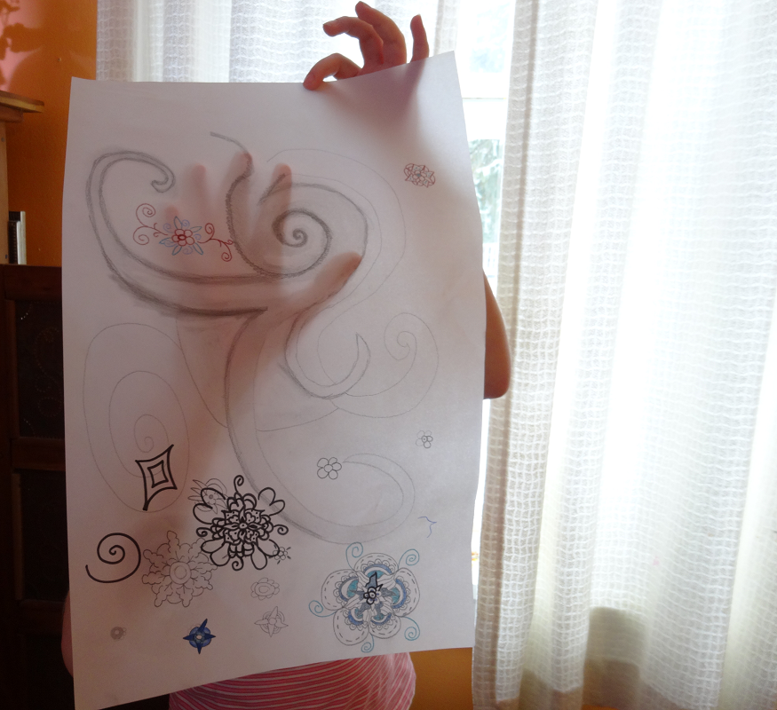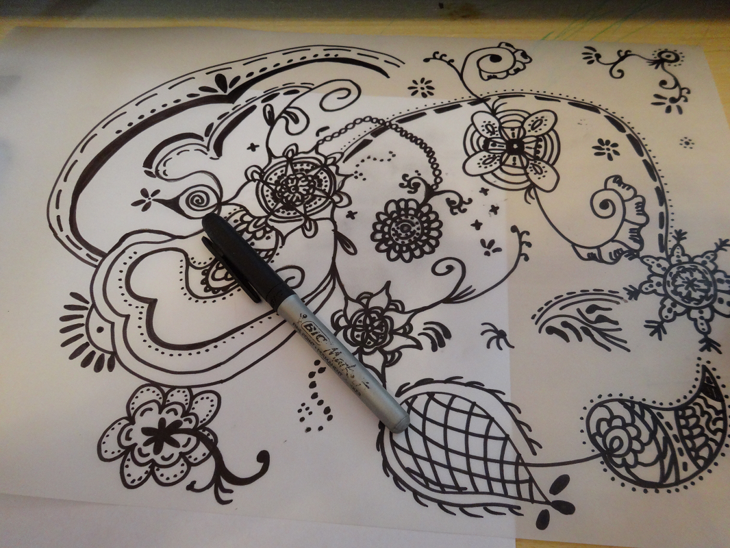 Next I wanted to see how line art would look on here, and started a henna tattoo inspired flower design. You can see it on the right with the blue pencil. This is my daughter holding the vellum up by the window so you can see how thin and translucent it is. Then I wanted to go further and play with henna art designs, so I grabbed a permanent marker. My pen and ink supplies are hiding in the basement somewhere, so I opted for the marker just to get an idea of how a design might look on here. Notice how crisp it is, no bleeding edges on those lines! I thought it might be interesting to show my doodles and tests to show my thought process.